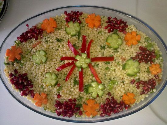 Kuskusu bol suda haşlayın. Biberleri fırında közleyerek küçük parçalara bölün.Maydanozu ve taze soğanları ince ince kıyın. Turşuları küçük parçalara bölün, mısırı ve garnitürü süzerek diğer malzemelere ekleyin. Kuskusu süzün ve soğuk sudan geçirin. İyice süzün ve tüm malzemeyi içine ekleyerek karıştırın. Zeytinyağı, limon ve tuz katarak servis yapın.